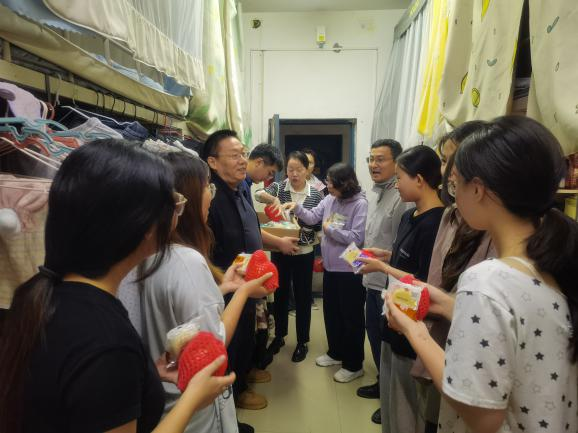 中秋佳节至,温情暖校园。10月5日上午9时,威廉希尔williamhill党委书记李志华、院长王小鹤、副书记程芬、副院长段恒耀及各年级辅导员组成慰问团队,带着象征团圆的月饼与寓意红火的石榴,分赴校园各处,为留校的本科生与研究生送去节日的祝福与学院的关怀。