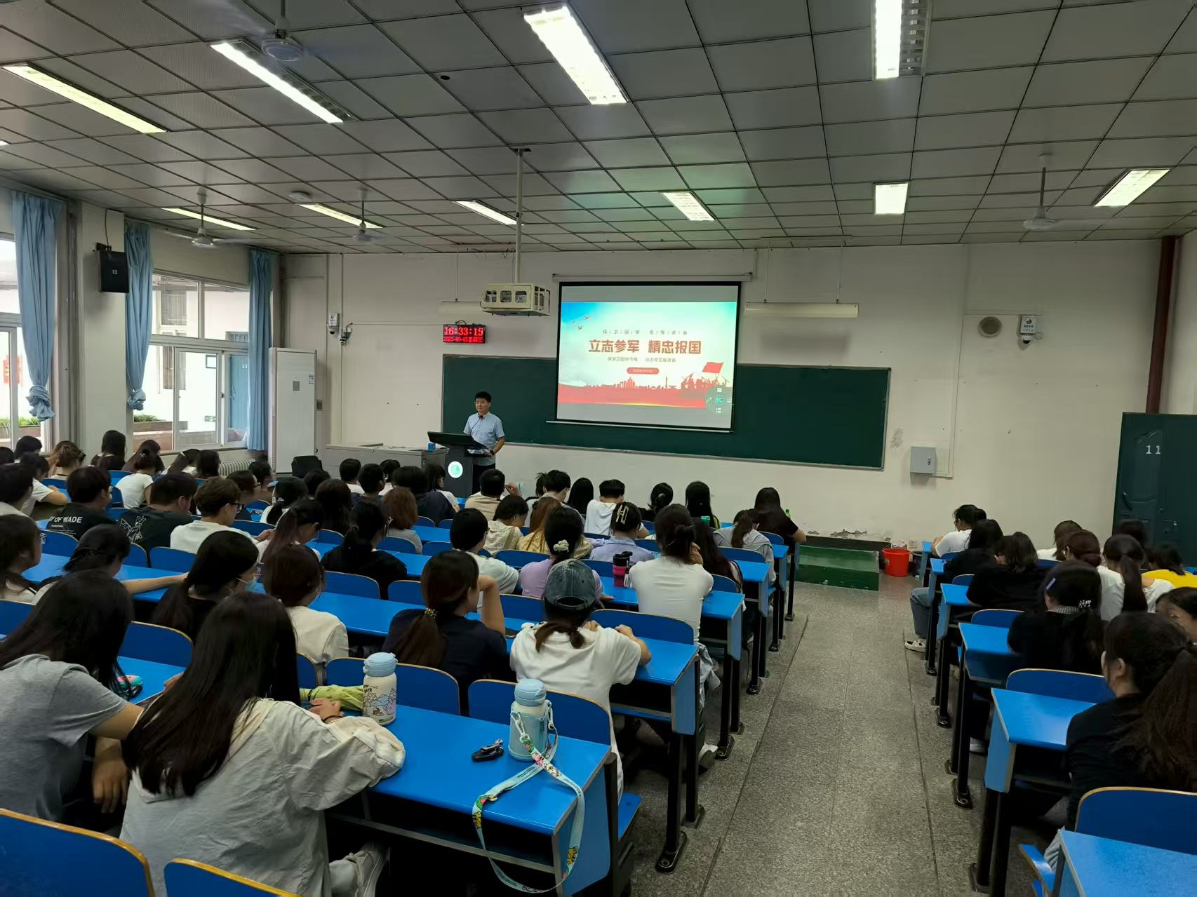 活动伊始,余昕阳老师结合征兵政策解读、军营生活分享和参军优抚待遇介绍等内容,用生动的案例和详实的数据,向同学们讲述了参军入伍对个人成长的塑造作用,以及青年一代在国防建设中的责任与担当。他提到,军营是锤炼意志、增长才干的“大课堂”,大学生参军不仅能为国防事业注入新鲜血液,更能在艰苦磨砺中收获终身受益的宝贵财富。